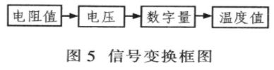 图5为信号变换框图,由电阻值可得数字量,反之单片机对A/D转换器采样的数字量进行处理,可通过公式2.5×(数字量/65.536)计算输入的模拟电压值,逆推出电阻值。由于热敏电阻PT-100阻值与温度具有分段接近线性的特征,并参考PT一100阻值与温度的对照表,将温度值每10℃分作一组与对应电阻值求其斜率,可根据单片机采样的数字量计算出相应的温度值。