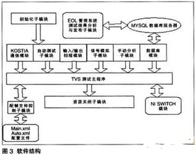 通过精心的设计和不断的实践,我们在KOSTAL中首先实现了一种能够通过配置文件实现产品测试软件开发的原型。通过它,我们基本不用修改LABVIEW程序,而只要调用配置文件进行配置就可以实现对新产品测试程序的开发。图1为TVS系统的整体结构图。
