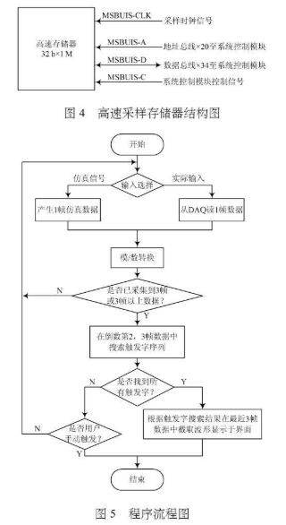 基于虚拟仪器技术的逻辑分析仪主要由数据捕获和数据显示2部分组成。数据输入部分将各通道的输入变换成相应的数据流;触发产生部分根据数据捕获方式在数据流中搜索特定的数据字,然后决定是否产生触发信号来控制数据存储器,以便开始或停止存储数据。数据显示部分将存储器里有效的数据以多种方式显示出来,方便对已捕获的数据进行分析。主程序流程图如图5所示。