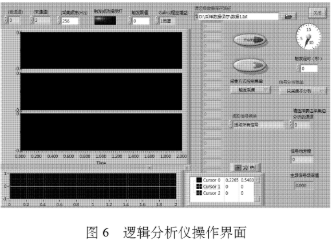 逻辑分析仪的设计采用模块化思想,包括主程序模块、DAQ信号获取模块、多通道仿真信号产生模块、合并数据流模块、模数转换模块、多通道波形连接模块、通道设置模块、序列触发模块、触发设置模块、截取波形模块等,主程序直接调用多个子VI程序。操作界面如图6所示。