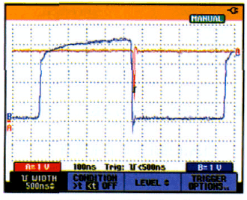 图3 利用示波表的脉冲触发功能捕获的一个比时钟脉冲窄的脉冲,通过这个信号可以确定,在该逻辑电路中,至少有一个外围部件工作不正常。示波表在窄于500ns的系统时钟脉冲的负向脉冲沿产生触发