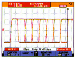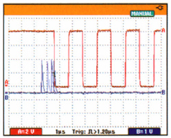 当使用更高速度的时基时,则能够更加明显地看出,串扰是由和450kHz的控制信号不同步的子系统引起的。使用余辉模式,可以像具有余辉的模拟示波器那样显示脉冲。