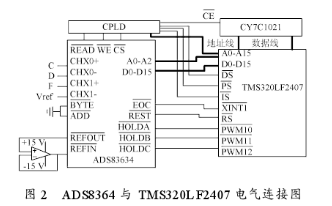 ADS8364与TMS320LF2407接口电路如图2所示。ADS8364的三位地址线接LF2407的低三位地址线,16位数据线与LF2407的16位数据线并行连接。3个采保信号分别由FL2407的PWM10,PWM11和PWM12提供。A/D转换结束信号接LF2407的外部中断1。BYTE接地使读取时得到的数据位数以16位的方式输出。