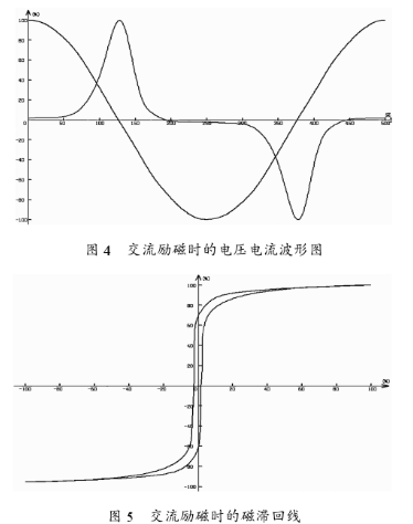 图4和图5分别为交流励磁时的电压电流波形及磁滞回线;图6和图7分别为交直流励磁时的电压电流波形及磁滞回线。由于电压电流的真实值相差太大,图上坐标均采用百分值显示。