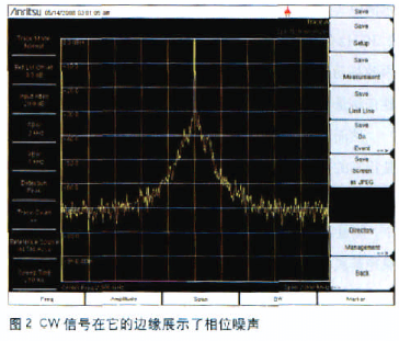 在频谱分析仪中,通过观察信号的“边缘”,可以很容易看到相位噪声。频率相当缓慢的倾斜就显示了相位噪声(见图2)。然而这幅频谱分析仪的图并没有显示抖动强度有多大。