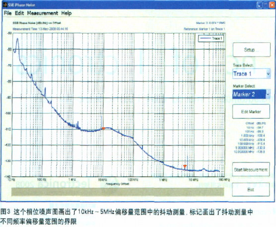 现代的频谱分析仪可以很容易测量dBc/Hz为单位的相位噪声,或者以角度、弧度或者秒为单位的相位抖动。频谱分析仪的相位噪声测量适用于中等质量的合成器,比如在商用无线用户设备或者毫微微蜂窝设备中的合成器,甚至可能用在基站中的合成器中。在这里的示例中(见图3),频谱分析仪测量得到2.3GHz的信号在10kHz~5MHz范围内的抖动是0.1°,很明显,它完全可以胜任测量本振的工作。