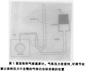 热是一种分子运动。物体越热,它的分子运动得越快,绝对零点的定义是,在这温度下一切分子运动都停止了。可是,我们既然不能看到分子在运动,我们怎样测量温度呢?美国全国标准和技术NIST所用的基本标准是根据理想气体定律,这定律表明,温度升高时,气体的压力或者体积必须按比例增加,此数字表示,P×V=KT,其中P=压力,V=体积,T=绝对温度,而K是个常数。在固定的体积中把分子速度加倍会使每秒钟的分子碰撞次数加倍,或者使压力加倍。在绝对零度下,理想气体会缩小到零体积和压力,图1说明固定体积的气体温度计,理想气体并不存在,不过氦接近理想气体,利用汞压力计用来测量气体和蒸汽的压力和可调节的容器来测量充满氦的玻璃球的气体压力。温度改变时,就调节容器中的柱塞,使压力计的左臂保持固定的高度,因而使氦保持固定的体积。右臂上方被抽成真空时,汞柱的温度就显示出气体的压力,因而也显示出氦的温度,原理很简单,可是要精确地测量就困难了。温度会影响玻璃球的体积,而连接管子和无玻璃球的温度并不相同,而且汞柱较小的变化和汞表面的弯月也限制了测量的准确度,比这些问题更重要的是,必须对氦与理想气体定律的偏离程度作出修正。因此,利用气体定律测量温度的方法主要是国家的标准实验,如NIST才使用。
