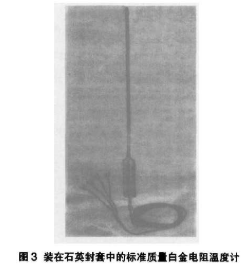 因为凝固点是受到空气压力和污染的影响,三相点是可以更容易地重复获得的。三相点是指材料是处于三相平衡,气相、液相和固相,要使温标有实效,可以在规定的固定点之间插入传感器。ITS-90规定几个这样的传感器负责测量温标的各部分,温标的中间是在氢的三相点和它的凝固点之间,其间插入高级的电阻温度计,称为标准的全电阻温度计SIRT、SPRT是用高纯度的白金导线精心制造烧制,而且以最少的支承物装配,因而不受拉紧。在三个或多个固定点把温度计标准后,就可以在这些温度之间使用这个温度计。温度计的R-T方柱是非常复杂的。必须利用电脑来处理。图3是封在Pvrex玻璃套中的SPRT。温标的最低端低至0.65K,是由氦气法定律测温法规定的,几个重叠的范围是由各自的复杂方柱和图表规定的,在温标的高端,水银的凝固点以上的温度则利用辐射测温法来规定,辐射测温法根据的原理就在于,红外或光辐射是随着温度的升高而增加的,旧式的IPTS也是利用白金合金制成的热电偶去温度规定温标的一部分,不过在1990年修订时已经被取消了。