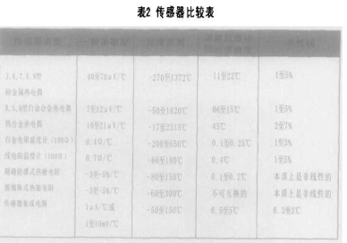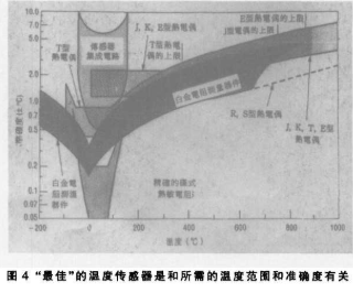 下面,我们来看看和比较一下商用的温度传感器:热电偶、电阻温度计、热敏电阻以及硅IC传感器。我们先开始迅速观察一下,表1比较了它们的特性,而图4是它们的工作范围和准确度。热电偶只不过是两根不同的金属连在一起。连接之后,它就会产生电动势,这电动势随着温度的升高而近似线性增加。热电偶的灵敏度,线性和温度范围是和所用的金属有关。多年来,已经有几种热电偶成为标准,在美国,NIST公布了八种热电偶,让字母代码来识别的毫伏~温度表。其中五种J、K、T、G和N是由碱金属合金制成,有不同的温度范围和用途,灵敏度一般是每摄氏度几十毫伏,其中三种R、S和B是用的金属白金制成的,当然这是常最昂贵的,是最稳定和可以重复的热电偶,最常用于高温工作的,不过灵敏度较低。有些厂商和经销商生产依照这些标准的热电偶导线和无指针。