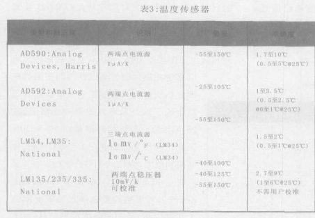 处于正向偏压的硅二极管和基极一射极结点往往可用来测量温度,在室温下,正向偏压的结点大的降压0.7V,它是有大的-2mV/℃的负温度系数。确定的电压和温度系数是和结点的几何尺寸、电流密度和其它因素有关,精确的校准需要在已知温度下单独测量每个二极管或者晶体管,PN结的基本方程是I=IO(eqv/KT-1)其中q是电子的电量,K是物理常数,称为玻尔茨曼常数,T是绝对温度开氏温度是常数,基本上等于反向偏压的泄漏电流,在室温下,KT/q大约是26mV,在正常的正向偏压条件下,-1这项是微小和无关重要的,可以忽略不计,所以I=IOeqv/KT,于是I=I/Io=V,温度传感器IC的工作原理是根据两个基极--射极电压之间的差值,这时结点的电流保持固定的比率I2/I21,对这方程进行一点代数运算就可以得出电压差 ,中的电路利用这个电压差值产生的输出电压或电流是和温度成正比的,表3列举4个IC,AD590和AD592的表现相同,不过较新的AD592便宜,采用TO-92的封装外壳,适用于教室的温度范围,超出这范围,准确度较严格。National的LM34/LM35是三端器件,在0°F或0℃下输出为零,LM135/235/335却是类似于齐纳二极管的器件,其输出和绝对温度成正比。我们来去看看AD592/590、AD592和AD590是输出为1μA/K,在0°C时是272.5μA的两端点稳压器。制造商在5代时把这校准,保证它在4代至3代之间的工作,不过要注意,提高电压会增加功耗,并且引起轻微的测量误差,图5说明它们是简单线路中的用途,可以得出从0℃或者0°F的数字计伏特的温度读数。