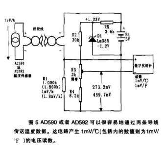 1μA/K的电流流过R1时,R1以1mV/0°C,1.000K或者1mV/0°F,1.8000K的灵敏度把电流值分为电压值,R1的两端电压是和绝地温度成正比,电阻R2、R3和R4提供的补偿等于R1和0℃或者0°F时的电压,这补偿是利用数字伏特计来调节的,要获得摄氏表的读数,必须把R3调到输出是273.2mV,华氏表的读数则应把输出调到459.7mV,如R1原来就是±0.01%,或者利用数字欧姆表进行微调,要达到IC规定的准确度并不需温度校准,如果想使用较低级的IC要轻松达到贝高的准确度。