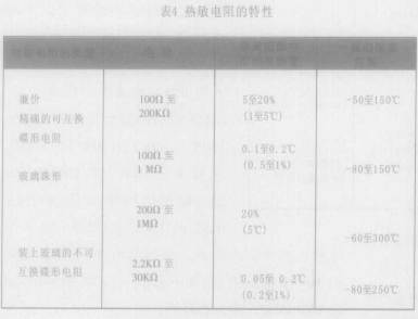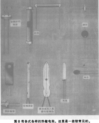 负温度系数的热敏电阻最适合测量温度,它是窄量程,高灵敏度和非线性的器件,它在25℃的电阻可从100Ω以下至1MΩ以上。它一般的灵敏度是-3%至-5%/℃。因此,其电阻的变化可以从每度几十欧姆到几万欧姆。制造负温度系数的热敏电阻要金属氧化物粉未,通常是氧化镍和氧化锰,有时还要加入其它东西混合制成。这些粉未以水与胶合剂制成为泥浆状,再压成需要的形状,圆片和圆柱型状等,然后干透,接着把干透的热敏电阻以1000℃以上的温度燃烧而形成耐火的类似陶瓷的结构。图8是常见的一些热敏电阻,测量温度最常用的是涂上环氧树脂的碟形热敏电阻,通常直径是在0.1寸以下,在较高温度下则使用类似大小而封上玻璃的碟形热敏电阻,有或没有封上玻璃的珠形热敏电阻具有较小的尺寸和快速反应。其尺寸从大约0.005寸到0.0005寸,在较大尺寸方面,在直径达1寸的柱形状,碟状和圆环状的热敏电阻有些制造商还生产热敏电阻传感器组件,包括从直条式指针至可以固定在晶体管外壳以及表面安装的组件。热敏电阻一向都是不太准确或者不稳定的,这是最便宜的器件的情况,在25℃时的一般电阻容限是在5%至20%之间,相当于准确度在1至5℃之间,在高温和低温之时,这容限会宽松一些。至少有三永公司YSZ,Fenwal和Thermomet-rics提供可更换的精确碟式热敏电阻涂上环氧树脂,适用的温度范围是从-80℃至150℃,在高低温两端的容限是大约1℃,它达到精确和稳定的办法是,在温度受到严格控制的热处理柜里把碟式电阻研磨到精确数值,以及通过老化测试和单独测试。