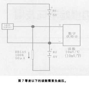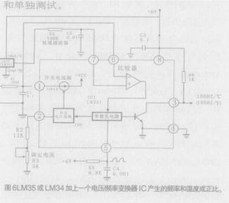 可以把R1换成可调节的电阻。让这IC处于已知温度下,把数字伏特计跨越在R1上。而且调节R1到lmV/度的正确读数,建议把IC放人封闭的护套中,而且把它放人均匀搅体的冰和水中,并达到平衡,微调R1,使它两端电压在0℃时为273.2mV,或者在320F的为491.4mV为止,依照上述办法调节R3,AD593有儿级别的型号,从25℃时的±5℃, AD590J到±5℃,AD590M,AD592获得保证的25℃,准确度是从±2.5℃,AD592AN至±0.5℃,AD59ICN,AD590的封装有T0-52,晶体管外壳或者扁平封装,而AD592在出装时采用T0-92型封装,National的LM34/35系列是更容易使用,这种三端IC输出10mV/0F,LM34或者10mV/℃。要读出温度只需一个数字伏特计和一个电池或者电压源,从4V到30V之间的任何电压,图6把一个LM34或者LM35和一个高电压/频率变换器LM351结合起来而产生和温度成正比的频率,图示的元件数值产生的精度100的输出,在100°F或100℃的输出是10kHz,要把它校准,可以暂时拆下这个传感器,提供精确的1000V输入,并且调节R3全输出为10.00V,不需调零,如果要改进容限较松的IC的准确度,可以把IC放在接近等量高端的已知准确度温度,并且调节R3的在获得正确的输出。LM34/35需要是负偏压去追踪零度以下的温度,图7说明其基本原理,这IC由止电源线供电,不过原把人约50μA的偏流加在输出上。LM35适用的温度范围有-55至150℃,-40至110℃是LM35C,以及0至100℃的LM35D,而25℃时保证准确度是±1℃和±0.5℃是LM35A,LM135的华氏