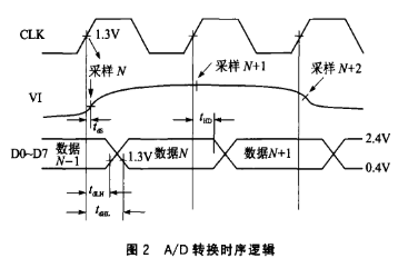TDA8703的输入电压和输出二进制码如表1所列,采样时序如图2所示。
