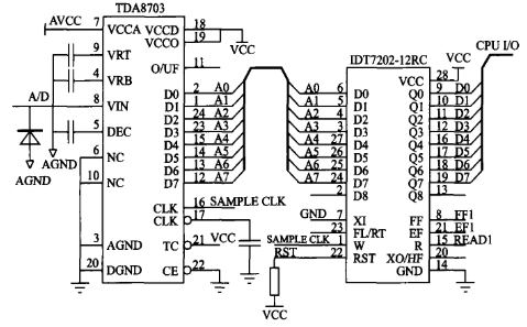TDA8703的采样时钟与IDT7202的写信号接同样一个时钟,这样便使两者同步。当采样1 024个点时,关闭采样时钟信号,IDT7202的FF端低电平有效,CPU把IDT7202中的数据取出并查询IDT7202的空标志位端;当低有效时,意味着IDT7202中的数据全部被取出,这时重新开采样时钟信号,重复上一过程。