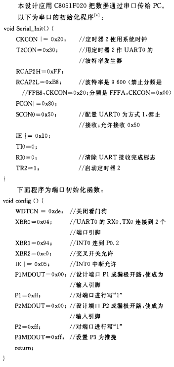 本设计负责信号传输的CPU是C8051F020。C8051F系列单片机是完全集成混合信号的系统级芯片,具有与8051兼容的控制器内核,与MCS-51指令集兼容;除具有标准8051的数字外设部件外,片内还集成了数据采集和控制系统中常用的模拟部件和其他数字外设及功能部件。C8051F单片机采用流水线结构,机器周期由标准的12个系统时钟降为1个系统时钟周期,处理能力大大提高,峰值性能可达25 MIPS。