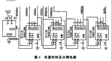 本设计ADC的采样率高达40 Msps,所以ADC的采样时钟用40 MHz有源晶振。有源时钟及分频电路如图4所示。