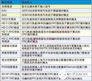 用户可以通过菜单选项手动捕捉视频数据,也可以让仪器在发现表1所列的任何一种视频错误时,自动捕捉一个视频帧。表1中的触发条件涵盖了SDI信号格式或视频信号电平中的一系列错误。