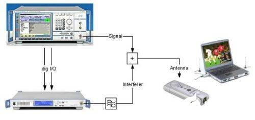 R&S SFU具备数字I/Q输出接口,可以把I/Q数据传输给SFE100,SFE100通过内部的I/Q调制器把接收到的I/Q信号实时调制输出。这个组合可以实现同邻频干扰测试。