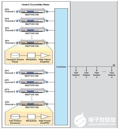 如图7所示,可以利用单独的测试发射机SFE100,或者利用CMW500、SMU/SMJ系列信号源来发生CMMB信号,也可以利用R&S公司推出的完整集中信号源来实现CMMB生产线测试信号。利用独立设备的测试方式比较多是用在小批量生产环节,而利用集中信号源的测试方式则是在大规模生产时需要考虑的。利用集中信号源可以构建一个完整的CMMB信号供给网络,为每个需要测试CMMB功能的测试平台提供所需的测试信号,而这一切可以通过R&S公司免费的控制软件遥控来实现。