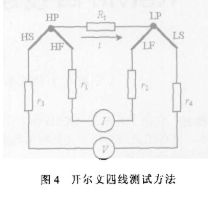 当被测电阻阻值小于几欧,测试引线的电阻和探针与测试点的接触电阻与被测电阻相比已不能忽略不计时,若仍采用两线测试方法必将导致测试误差增大。此时可采用开尔文连接方式(或称四线测试方式)来进行测试,如图4。