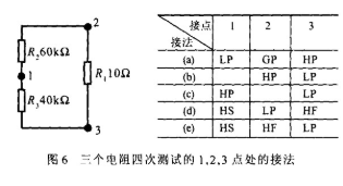 在这种情况下可以采用一种变形的开尔文连接方式来进行测试,不再使用隔离方法。它仍采用四根线,但根据需要将其中一对或两对F,S线分开接在不同的点上来进行测试。这种方式称为分离开尔文连接方式。本例中三个电阻要进行四次测试才能计算出它们的阻值,四次测试的接法分别见图6中的表,图中1,2,3点为连接点。图6-(b) 接法可直接测出R1的值;图6-(c)可测出 R2与R3的并联值R p;图6-(d)和图6-(e)分别测出阻值R2 ′和R3′。分析可知