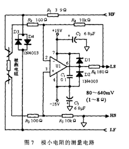 对于极小阻值范围的电阻测量可以采用图7所示电路完成,它可以测量10~ 80mΩ的电阻。通过差分运算放大电路,把被测电阻产生的微弱电压信号放大100倍,因此实际电阻值是测量值要除以100。图中运放UI采用低噪声、高速、精密运放,如OP-37EJ,AD645或MAX400。和高电位施加线(HF)串联的电阻R1是用来匹配电流施加模块的最佳输出负载,R2到R5采用高精度高稳定性的电阻来保证差放电路增益的稳定,这决定了测量的精度和重复性。为了保证精度,对运放的电源电压要求很高,电路的安装位置要尽可能靠近被测电阻,所有探头要尽可能短,C2,C3要尽可能靠近运放。