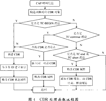 TCAP有两个重要概念:对话和操作。在网络中一对节点之间使用TCAP进行的所有通信都被结构化为对话。例如,为处理一个智能呼叫而在SSP和SCP之间进行的所有通信可构成一个对话。在对话过程中交换的信息元素称为操作,CAP协议的消息即存放在这些信息元素中传输。操作由源TC用户调用,请求目的地TC用户执行该操作指定的动作。在这个过程中,每个成份处理TC原语均带有一个事务ID(也称对话ID),成份子层收到此原语后,就将收到的对话ID与其相同的所有成份分配给这一对话。因此,我们在CAP的CDR过程中,以Transac-tionID作为关键字CDR ID在数据结构中进行查找,匹配,确定惟一的CDR流程。TransactionID又分源事务ID和目的事务ID,分别存在于不同的TC原语中。