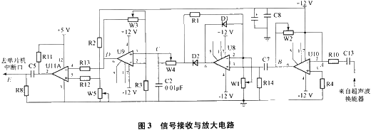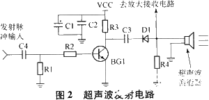 超声波发射电路较为简单,如图2所示。由于发射和接收是同一换能器,且测压液柱较短,所以这里不宜采用连续波发射,我们采取单脉冲波发射方式,由单片机发出启动脉冲,经过微分电路,使得三极管瞬间导通,在超声波换能器上得到一个前沿很陡的高压脉冲,由此换能器向液面发出超声波脉。