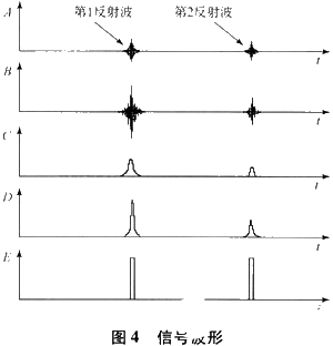 由微分放大电路组成输入级,来自超声波换能器第1反射波(4点)得到进一步放大,同时使第1反射波信号变得更尖陡(B点),该信号再经精密检波电路检波、滤波后,得到反射波的包络线(C点),为消除地线及杂波等干扰信号,同时增强信噪比,C点的信号再经过一个带有域值比较的放大器进一步放大,得到一个比较干净而幅值足够大的第1反射波信号(D点),最后经电压比较器,输出触发信号(E点)给计数系统,使其停止计数。至此,完成反射波信号的放大与处理任务。各点的波形如图4所示。
