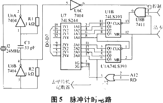 控制系统采用MCS-51系列单片机,当单片机采用12 MHz晶振时,其最高记数频率为500 kHz,而超声波记时系统采用的是24 MHz高频脉冲,因此通过74LS393把24MHz高频脉冲进行256分频后变成93.75 kHz,再送给单片机计数,见图5。