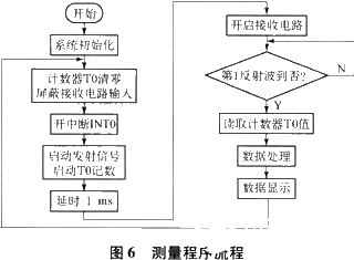 该系统的软件设计着重解决实时和同步问题。首先,在发射超声波的同一时刻启动计数器计数;其次,接收到第1反射波的同时,立刻停止计数器计数;再次,由于发射和接收是同一超声波换能器,所以超声波的发射端和接收放大电路的输入端连接在同一点,在发射波发出的同时,接收放大电路同样收到发射信号,如不采取措施,会误将发射波当做有效的反射波,计数器在启动的瞬间就会被关闭,造成误操作,所以此时要采取必要的措施,对放大器的输入端进行屏蔽处理。