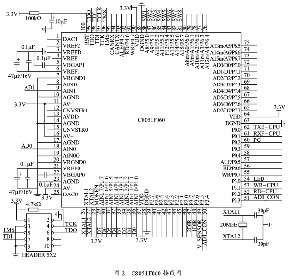 C8051F060单片机的P0.O配置为外部中断源(INT0)。P0.1配置为外部中断源(INTl),下降沿触发输入,当USBl00模块接收到工控机数据时触发INTl中断。PO.2配置为通用I/0,当电池电压低到一定程度时被MCU检测到并做低电压处理。P3.0~P3.7配置为通用I/0,P3.0用于驱动发光二极管,P3.1用作USBl00的写控制线,P3.2用作USBl00的读控制线,P3.3、P3.4用作模拟控制开关的控制线,P3.5用于控制传感器的供电(当不需要采集数据时关掉传感器电源以减少系统功耗),P3.6、P3.7用作电平转换芯片74ALVCl64245的数据方向选择控制线。P1配置为通用I/O,作为8位并行数据线。P5配置为通用I/O,作为8位拨码开关的输入,用8位拨码开关设定MCU的数据采集速度。C8051F060接线图如图2所示。