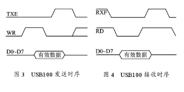 接收时序如图4所示,当单片机检测到USBl00模块RXF为低时,表示内部接收缓冲区有数据,可以通过8位数据总线DO~D7发给C8051F060单片机,接收数据锁存由RD控制。