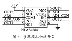 因为C8051F060只有2路高速A/D转换器,而实际上有4路模拟量需要采集,故需要一个多路模拟切换开关。NLAS4684是两路单刀双执CMOS模拟切换开关,具有很低的导通电阻。当ADO_CON、ADl_CON为高电平时,运放的输出OUT2进入ADO进行A/D转换,运放的输出OUT4进入ADl进行A/D转换;当ADO_CON、ADl_CON为低电平时,运放的输出OUTl进入ADO进行A/D转换,运放的输出OUT3进入AD1进行A/D转换,如图5所示。