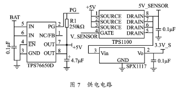 平,R1为外部上拉电阻。TPSll00为大电流驱动能力、低导通电阻的电源分配开关;输出5 V电压为传感器电路提供恒流源,通过SPXlll7稳压成3.3 V为传感器放大电路供电。为了节省耗电,C8051F060可以通过TPSll00的4脚关掉传感器电路的恒流源和放大电路。