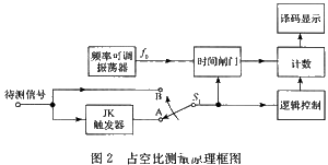 先取出一路待测脉冲信号,经触发器变成宽度为TA的方波信号,通过调整振荡器的频率使显示器显示100,然后将待测信号直接输入到时间门控电路,显示器显示的读数就是待测脉冲信号的占空比。