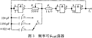 为了使经触发器的信号通过脉冲计数显示100,振荡器的频率必须在较大的范围内连续可调,于是采用如图3所示的频率可调振荡器,振荡器由4个2输入与非门74F00环形构成,如果电阻R1选510 Ω,电容C选220 pF、2 200 pF、0.022μF三组不同的值,则振荡器的频率f0可在40 kHz~4 MHz的范围内连续可调。