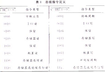 在地址传送阶段,C/BE[3~0]线上送出总线指令的编码信息。总线指令用于对目标设备说明当前总线控制者正在进行的总线传输类型。表1给出了总线指令的定义。