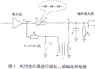 在实际测量仪器的中频滤波器设计中,为了减少引入大量噪声和失真,往往采用将输入电压VINPUT通过合适比例的变压器产生AVINPUT的方法来实现。图4为利用变压比为1:4的变压器实现正反馈进行幅度补偿的示意图:将VINPUT接入变压器的初级线圈,将变压器的次级线圈的励磁电感作为RLC电路中的L。