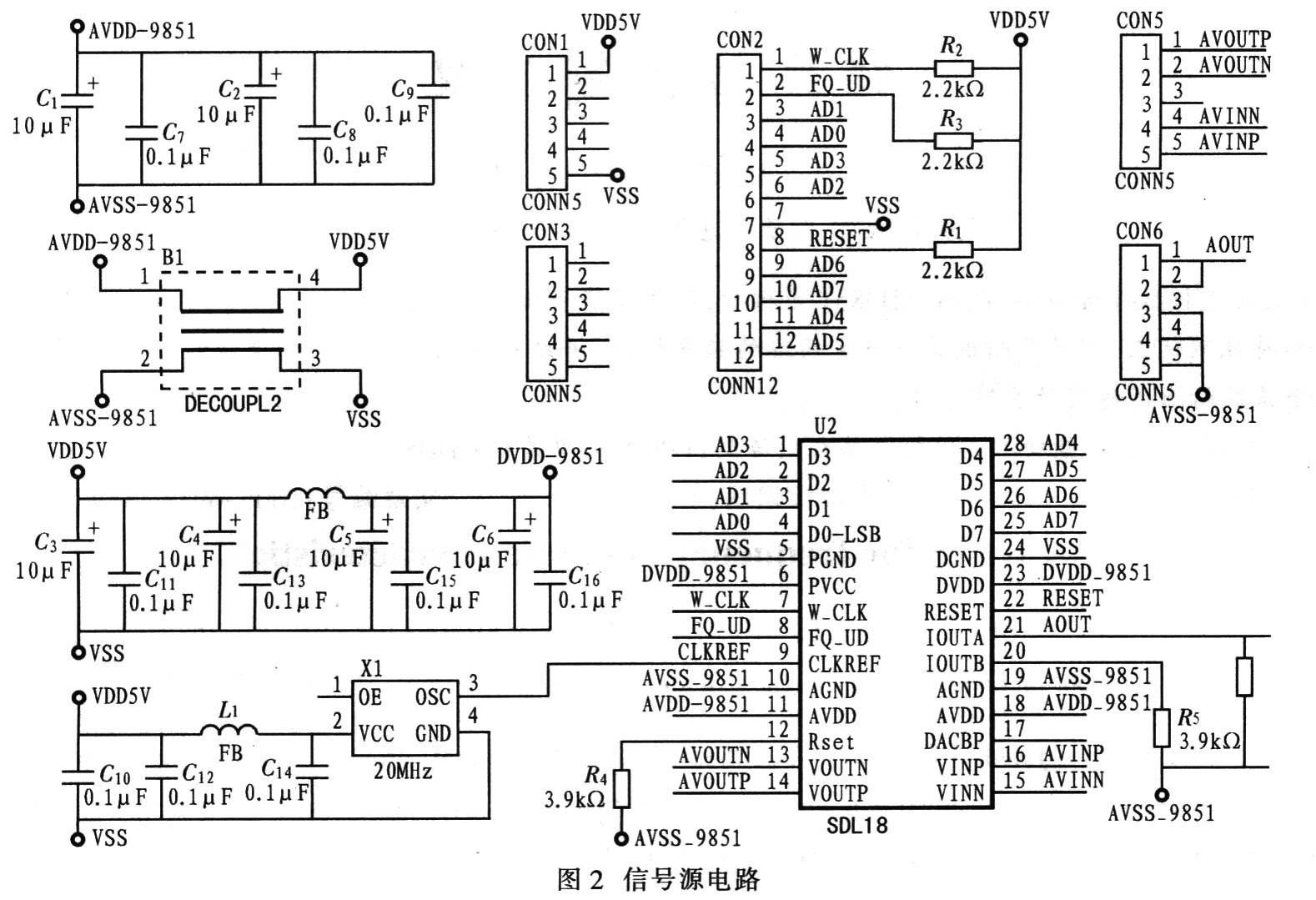 信号源电路是以集成的DDS器件AD9851为核心,并结合外围电路而构成的。为减少干扰,稳定输出频率,系统设计将AD9851及其外围电路集成在印制电路板上。图2给出其原理图。