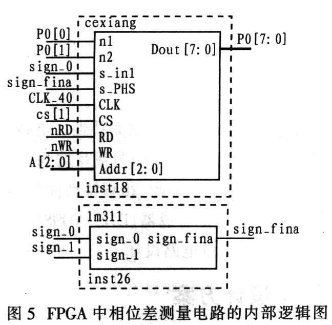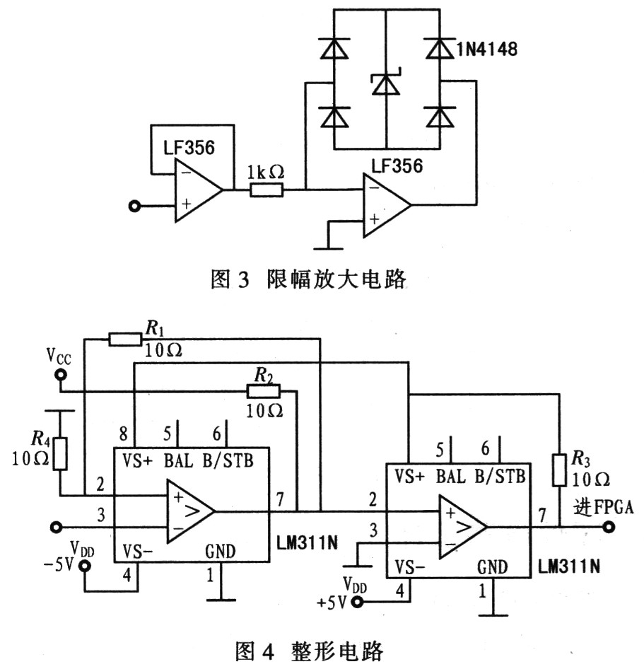 相位差测量电路由限幅放大电路及整形电路组成。限幅放大电路应选超高摆率,输出电流大,耐压高的运算放大器。同时,为使进入比较器的信号更稳定,应选取增益带宽积较大的运算放大器。因此可选取图3所示的LF356限幅放大电路。经限幅放大后的两路信号需经相同的整形电路才能进入FP—GA进行相位差测量,其具体的一路整形电路如图4所示。该整形电路以LM311作为过零比较器,采用迟滞回环比较接法,可有效避免在过零点时因信号干扰和抖动带来的跳变。图5给出FPGA中相位差测量电路的内部逻辑图。其工作原理是:首先将两路信号异或后,与其中任意的一路信号相与,得到与原信号频率相同,以及由占空比反映相位差大小的方波,再对该方波和原信号同时计数,判断极性后,即可得出相位差。