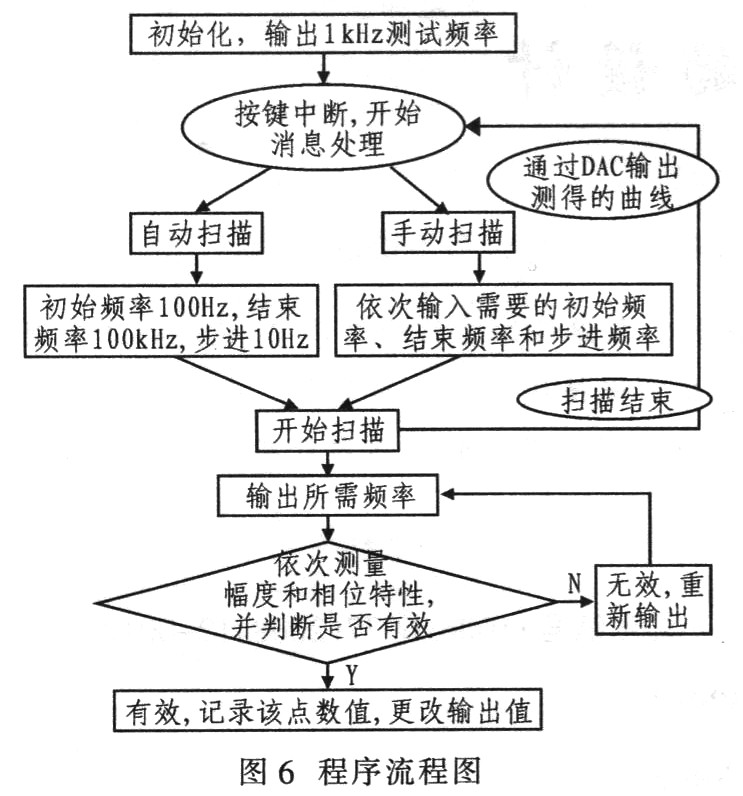 在编写软件时.通过按键中断程序将自动和手动扫描分为两个子程序。主程序则在开始扫描时合并这两个子程序,实现频率特性的测量,这部分代码由循环结构和判断分支结构重复判断并输出。