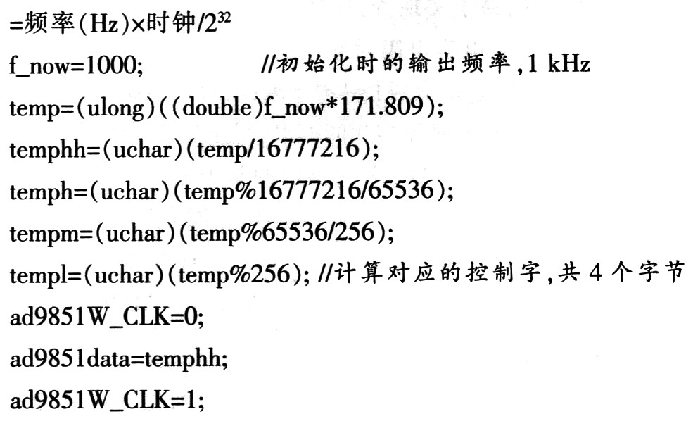 AD9851的输出频率与控制字的关系为:控制字(32 bit)=频率(Hz)x时钟/232