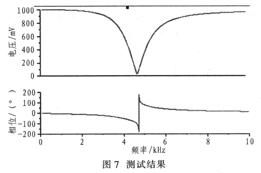 系统测试时选用双T网络(中心频率为5 kHz)作为被测网络。图7给出实测的幅频及相频曲线。由图可见,实测曲线中,该网络的中心频率在4.8 kHz附近。