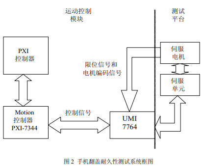 本系统利用NI Motion 控制模块对伺服电机运动进行速度控制,按照用户设置的参数驱动相应的拨片、拨杆控制手机翻盖的开合。整个系统框图如图2所示: