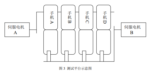 整个系统由两部分组成:运动控制部分和测试平台部分。运动控制部分由NI PXI控制器和运动控制模块NI PXI-7344发出运动控制电压信号V-REF,通过NI UMI 7764接至伺服电机驱动器。测试平台部分包括两套独立的平台,每套平台有一组电机控制4台待测手机翻盖的开合(见图3)。全部4台电机的控制信号分别由NI PXI-7344的4轴提供。每台电机上均有编码信号反馈至运动控制模块以形成闭环控制回路,另有Forward Limit和Reverse Limit信号反馈至运动控制模块用以确定系统的初始位置以及防止电机运动超出极限位置。