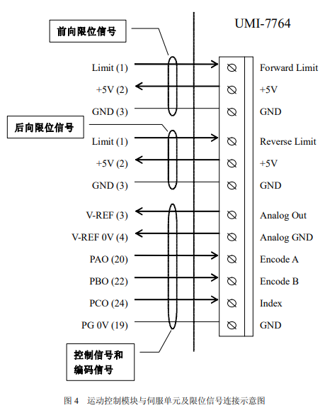 硬件配线包括伺服单元与伺服电机的连接、运动控制模块与伺服单元的连接。其中伺服单元与伺服电机的连接有专用的电缆和相应的端子定义,与伺服单元和伺服电机的的类型有关。下图是运动控制模块与伺服单元的连接以及限位信号的连接图: