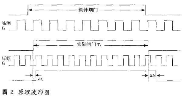 最简单的测量频率的方法是直接测频法。直接测频法就是在给定的闸门信号中填入脉冲,通过必要的计数电路,得到填充脉冲的个数,从而算出待测信号的频率或周期。在直接测频的基础上发展的多周期同步测量方法,在目前的测频系统中得到越来越广泛的应用。多周期同步法测频技术的实际闸门时间不是固定的值,而是被测信号的整周期倍,即与被测信号同步,因此消除了对被测信号计数时产生的±1个字误差,测量精度大大提高,而且达到了在整个测量频段的等精度测量,其原理框图和波形图如图1所示。