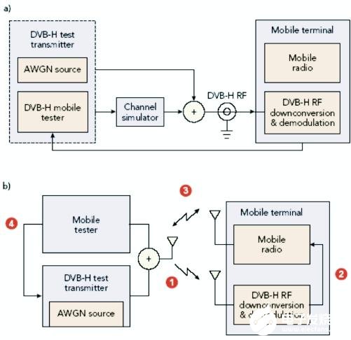 对于移动终端的特性测试,需要用DVB-H测试发射机建立实际的发射环境。为了模拟实际环境,还要在测试发射机上添加校准的高斯噪声(图4a),再将合成信号送到被测移动终端的接收机部分。BER测试将获得接收机具有的处理这些噪声条件的能力。